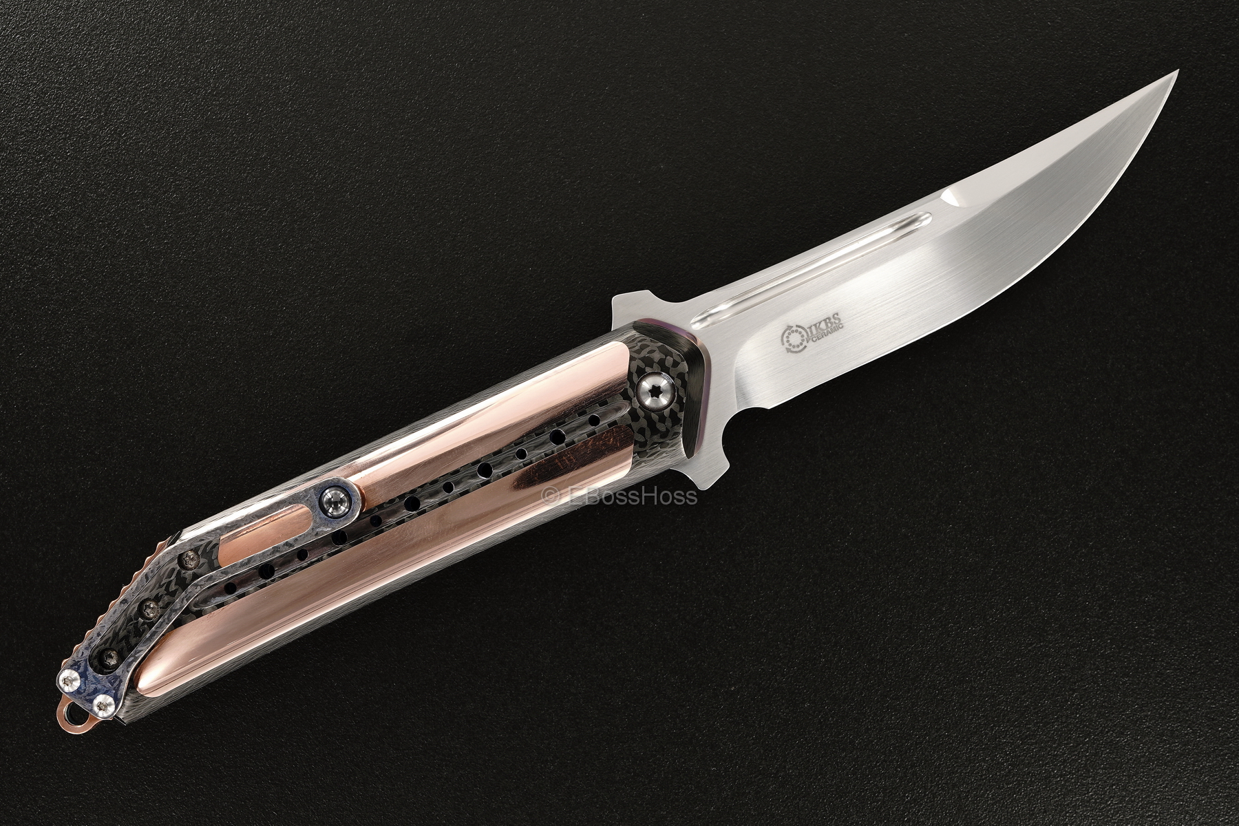 • Copper and Carbon-Fiber Contoured Handles--Polished, Fullered, and 11 Holes per Side (not a coincidence)