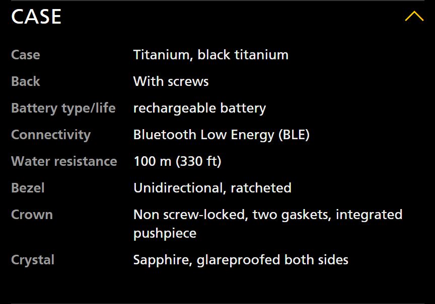 - Complications: Analog and 12/24 hr LCD digital display, display backlighting, EOL indicator, digital, perpetual, with weeks indication, Chronograph with Seconds, Minutes & Hours; Date, Second Hand, Uni-rotational Bezel, 1/100th second, max. 99 hrs 59 min. 59 sec., flyback function, electronic tachymeter, chronograph (lap timer, flight times) countdown timer, 7 daily alarms, CountDown/CountUp Clock, (max. 99 days, 23 hrs 59 min. 59.99 sec.) with independent alarm, UTC worldtime; pairing possiblity (Bluetooth Low Energy) with a smartphone (dedicated Application) for data transfer and «remote» settings