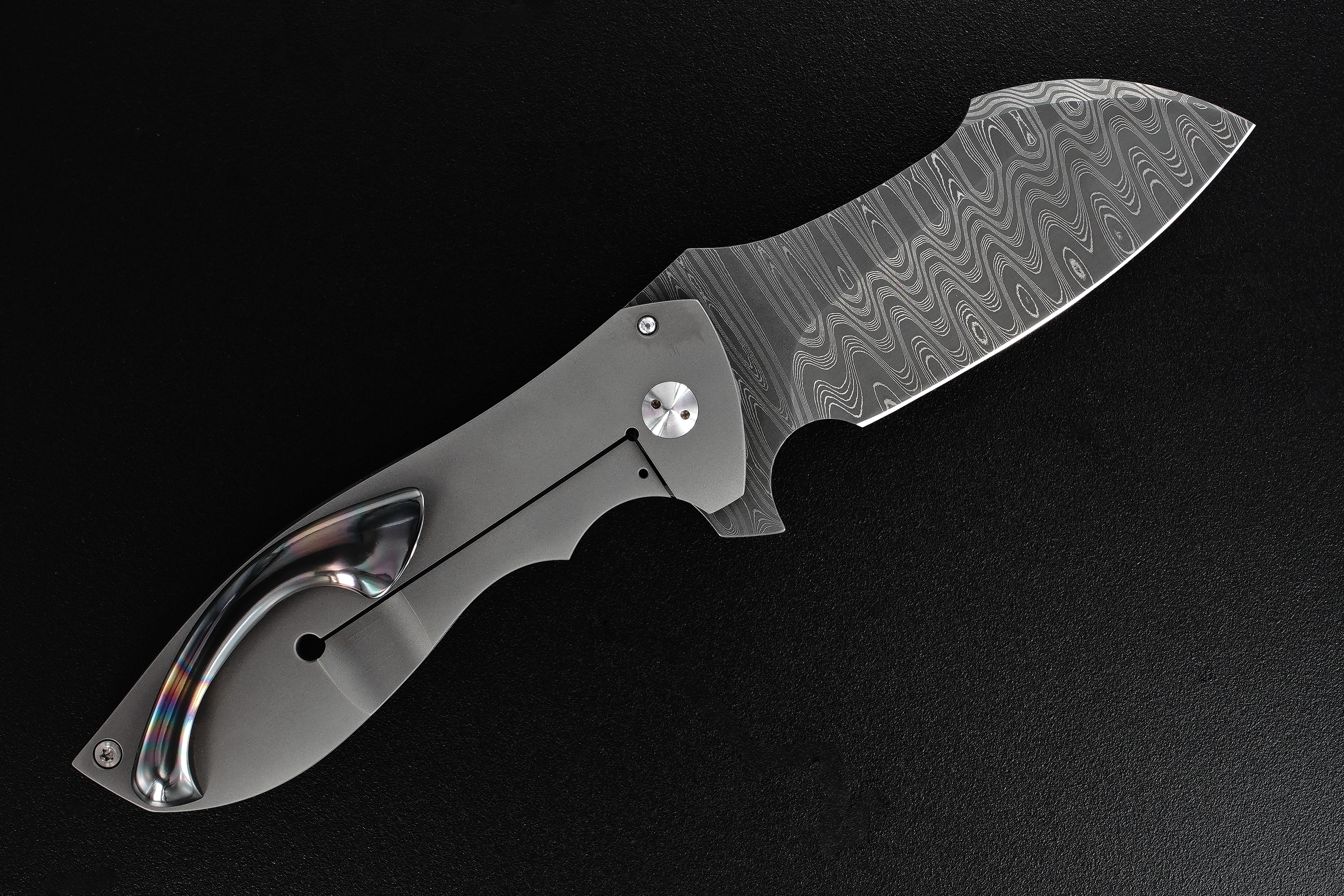 - Chad Nichols High-Contrast Ladder-pattern Stainless Damascus Hollow-ground Recurve Blade with a Convex-ground Swedge