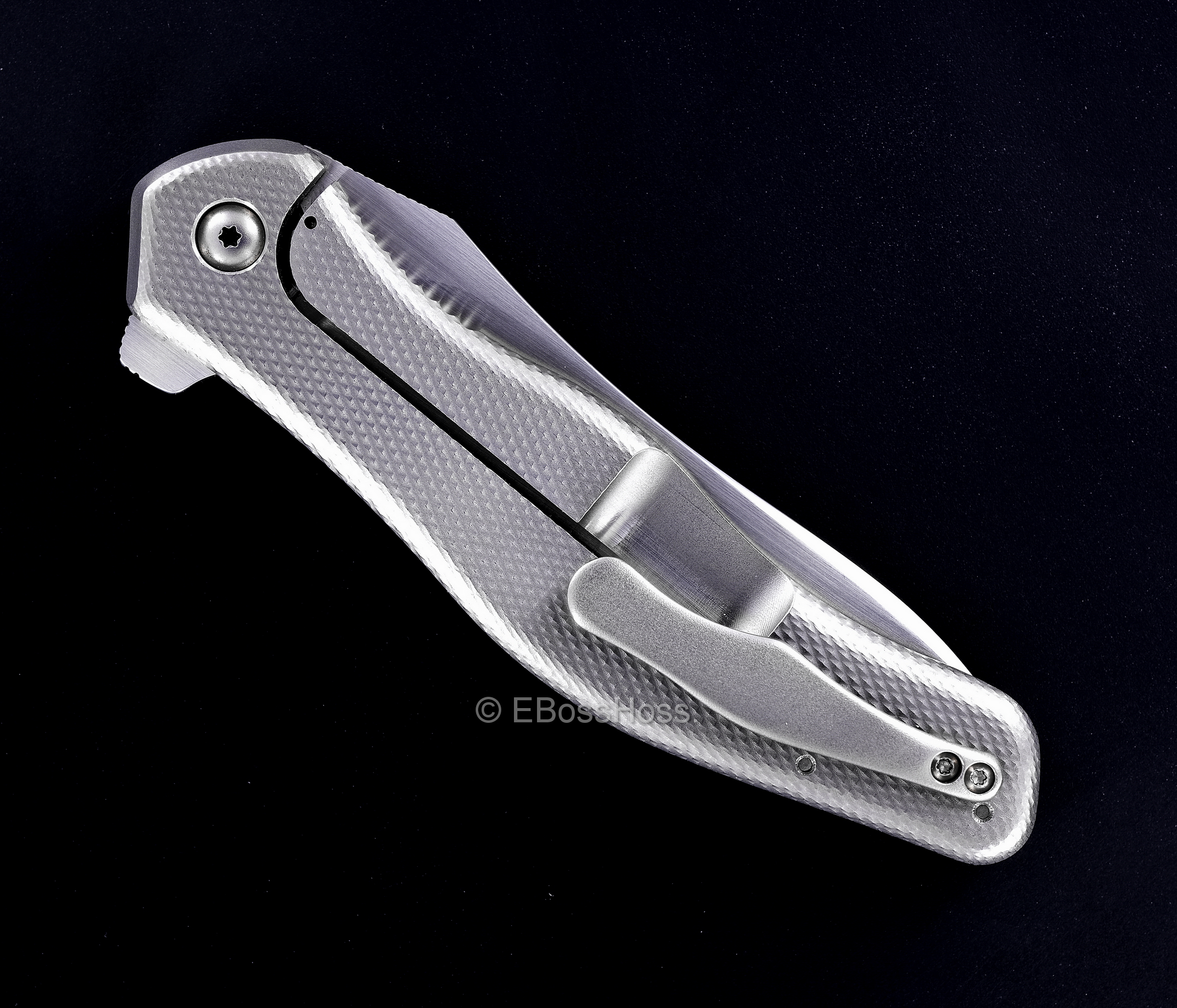 - Contoured and Sculpted Diamond-Texture Titanium Framelock Side