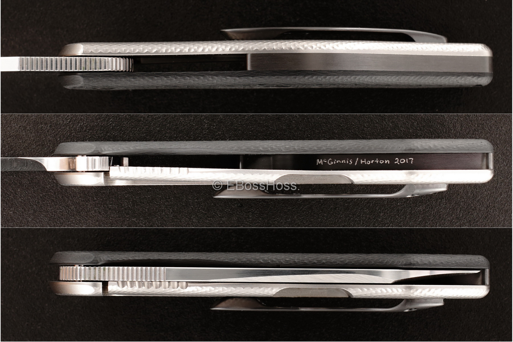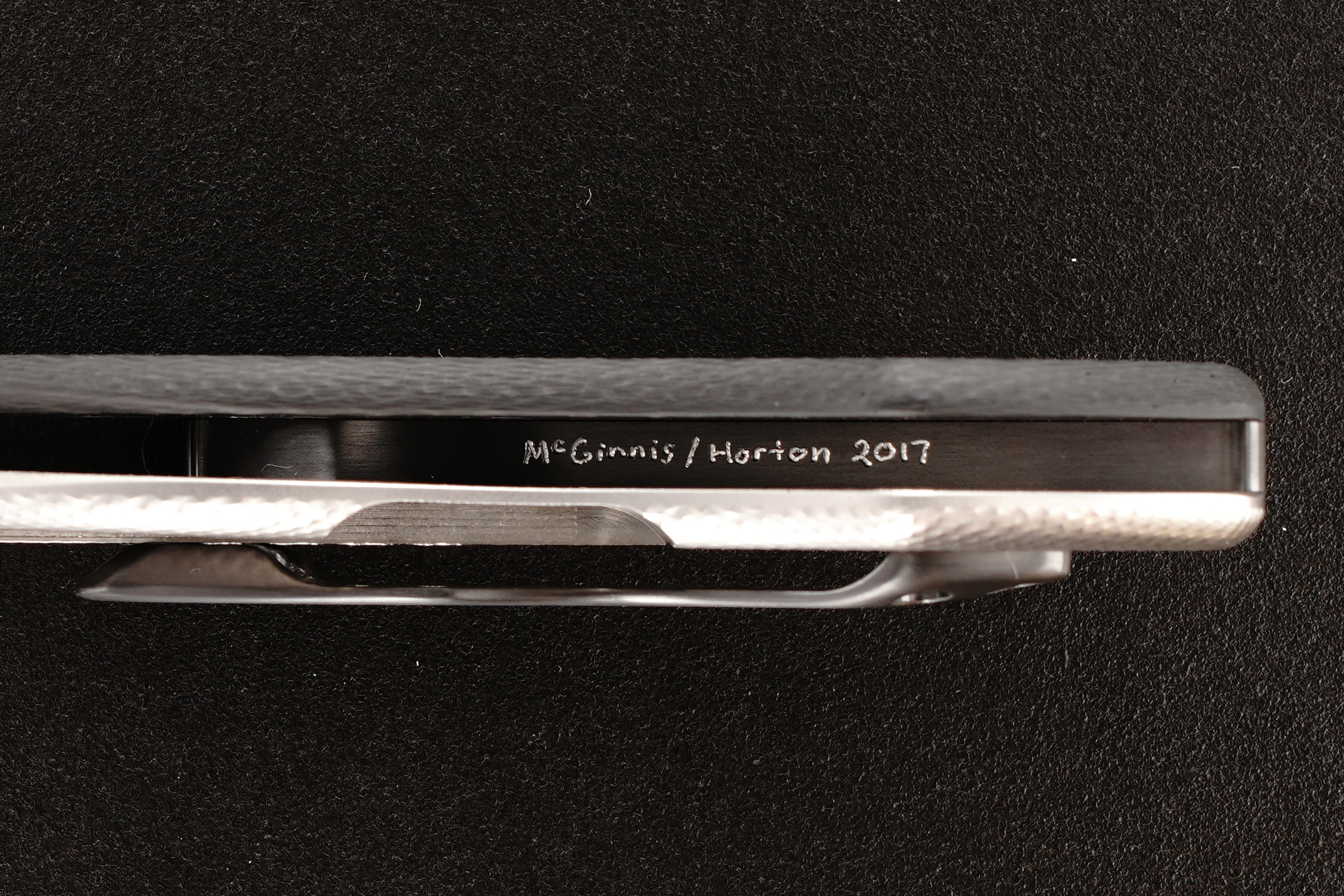 - Hand-etched (inside the Handles) "Peligro R 060" "5-29-17" "154V" "2015" "McGinnis / Horton" & "Blade 2017"