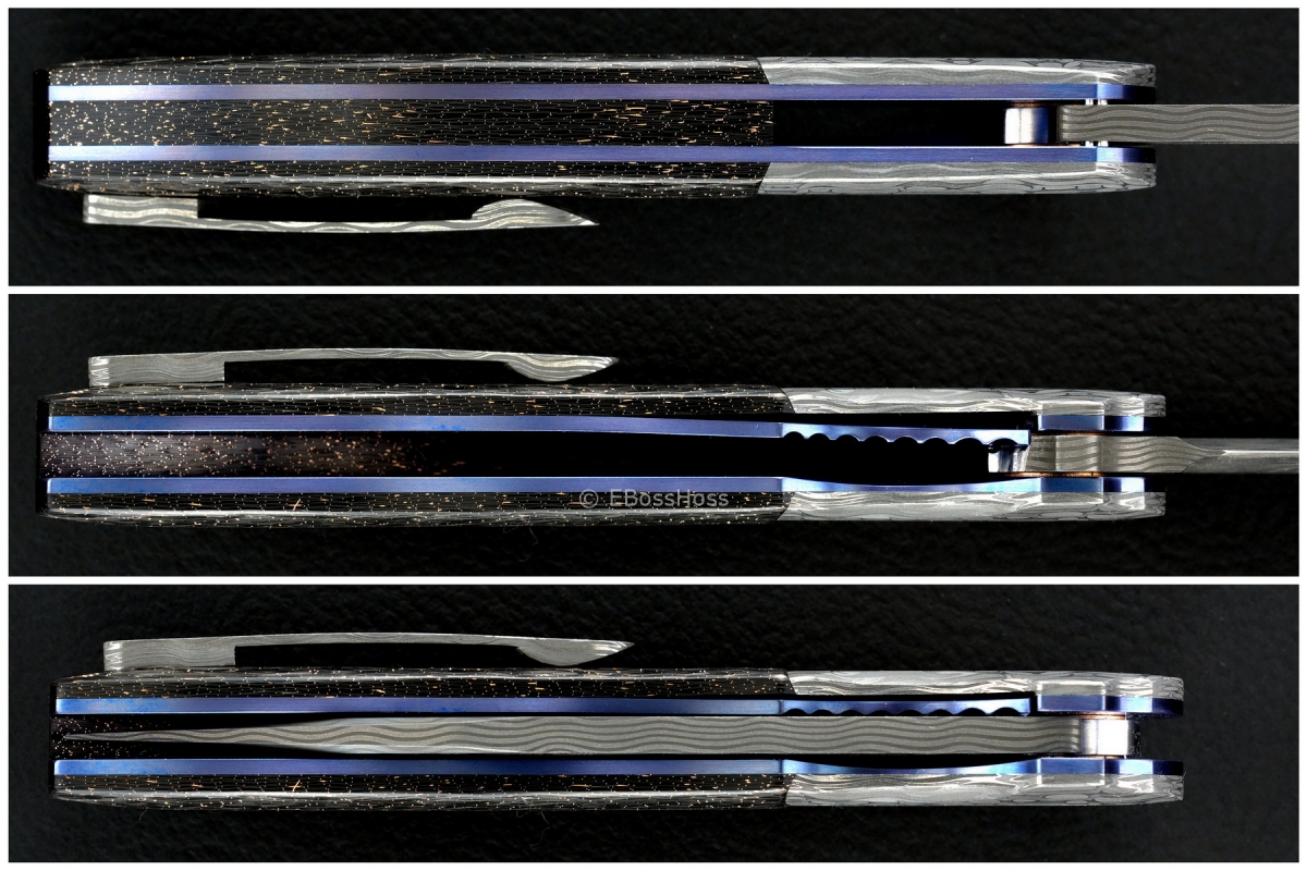 • Beautifully Contoured and Dovetailed Transitional Damascus Bolsters with Dual-Scallops to Facilitate both Righty or Lefty Blade Deploy