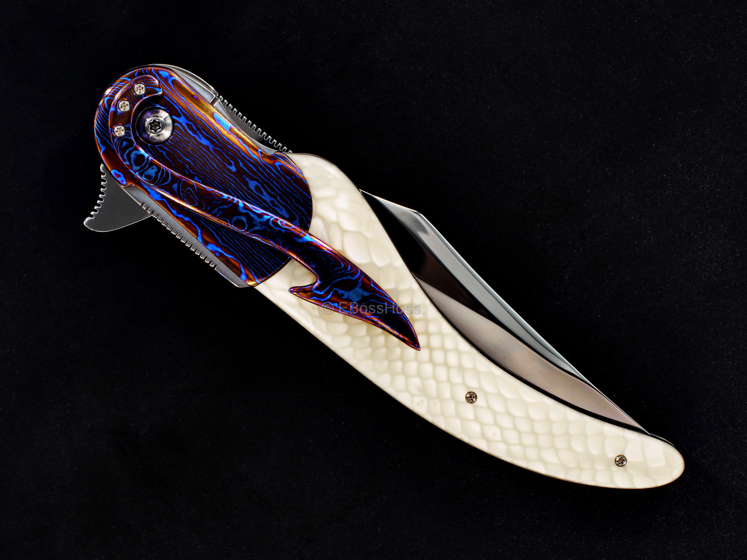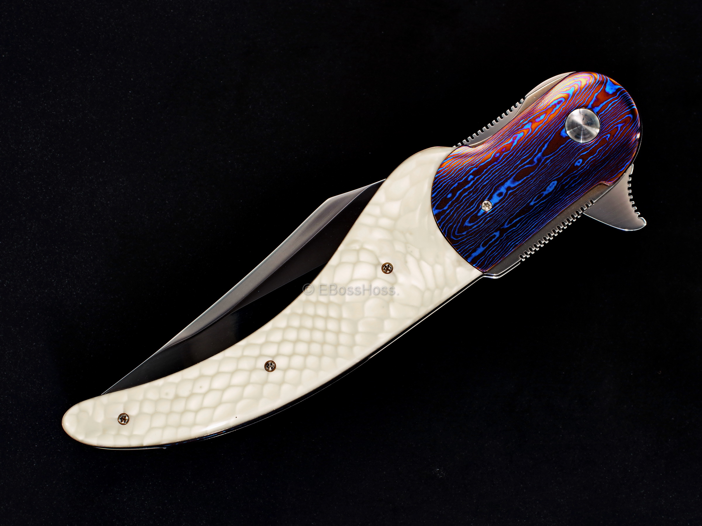 - Sculpted and Radiused and High-Polished Timascus Bolsters