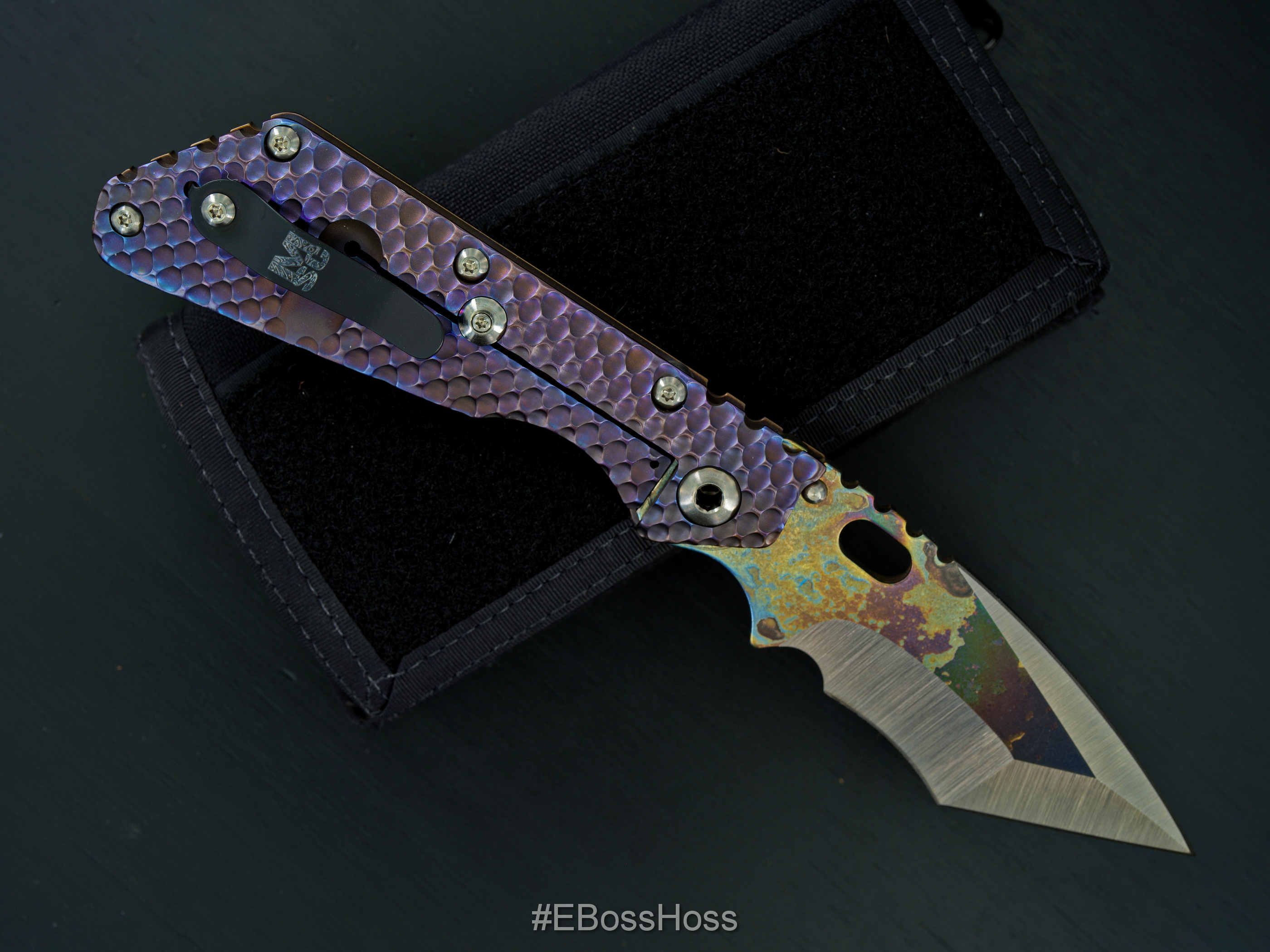 • Hand-ground Belly Nightmare Recurve Tanto Recurve Level IV Strike Plate Torch-colored Titanium Blade
