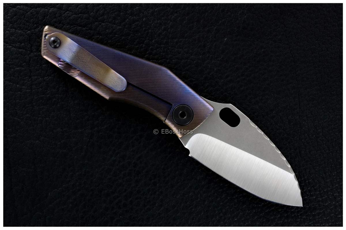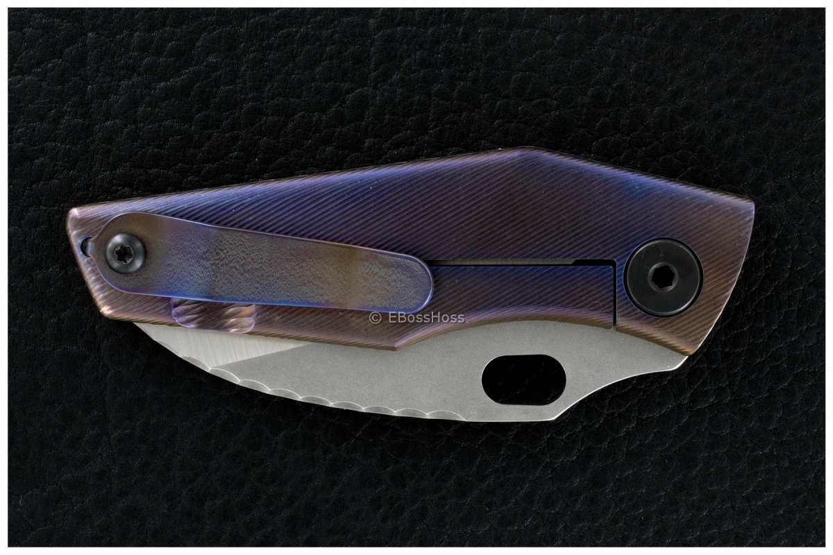 The knife is stunning in its successes though, so thoroughly that it is hard to know where to begin. Not since Christian Wimpff's** ultraclean minimalist designs of 20 years ago has there been a usable tac folder this elementally sound. And, it does so not in copying him but by trumping his effort. The handles appear at first look to be angular, all lines and flats, not unlike a 'lego' SnGs. But in the hand, it is all curves in all three dimensions! There is a subtle palm swell, vertically and horizontally, that allows it to fit the hand well. The lower handle line has a large radius curve that also allows for excellent grip despite different hand/finger sizes. And, in a very rare design cue, the thumb ramp is negatively curved to mirror the pad of the thumb that will rest there. The result of all this is an organically comfortable fit that lets the wielder of this knife have superb control in the all-important saber grip.