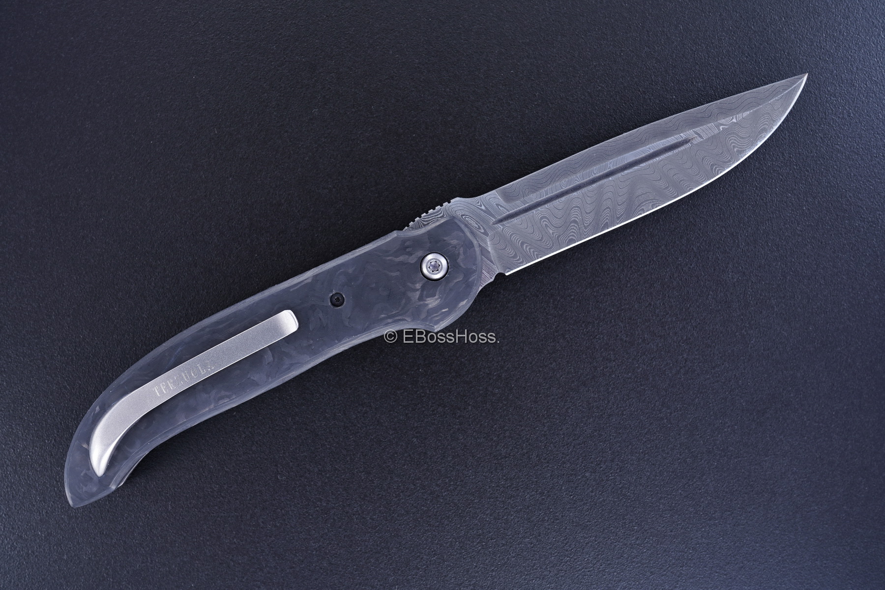 - Hollow-ground Swedged Chad Nichols Fade Damascus Blade with Dual Fullers