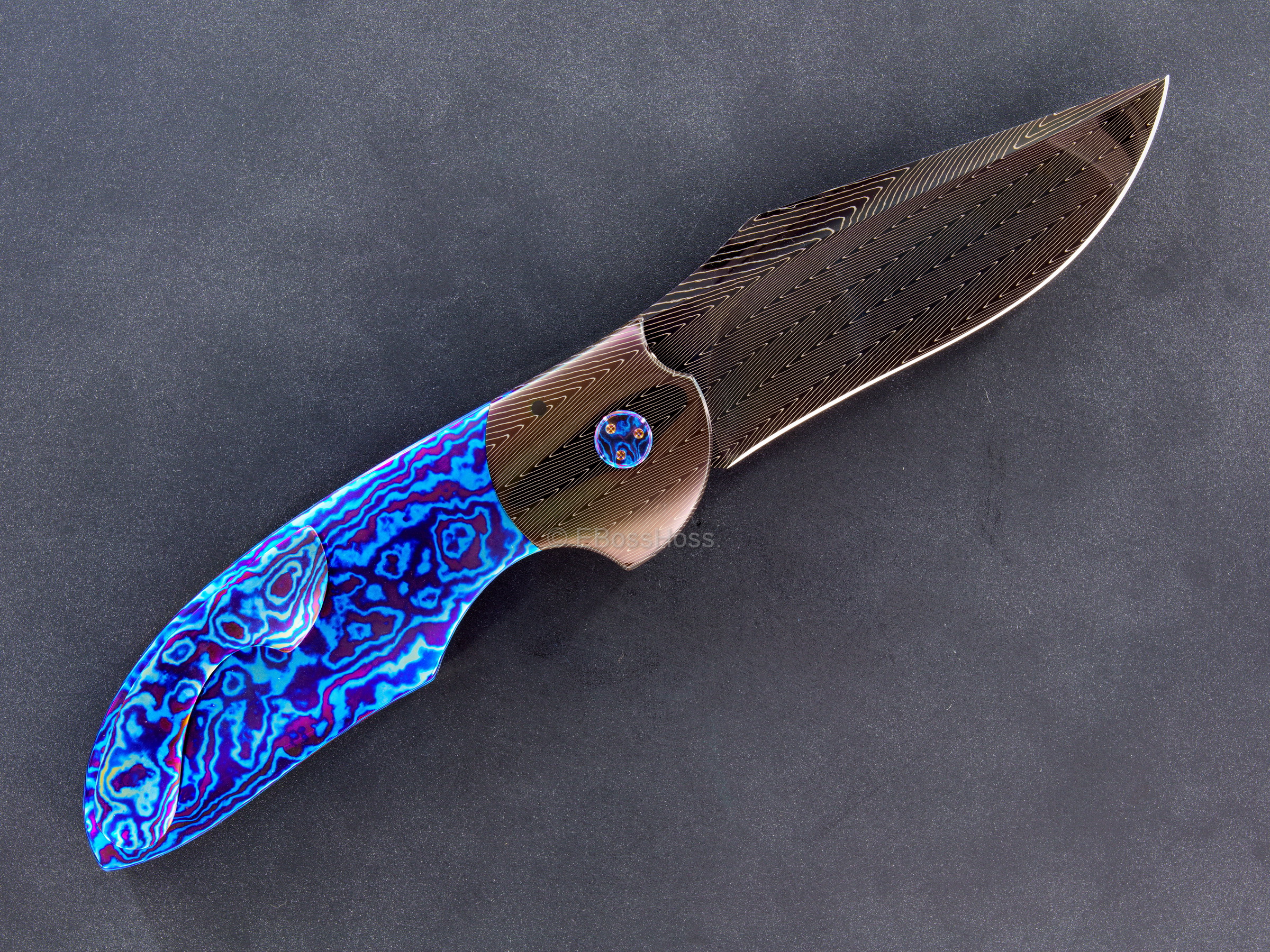 Rob Thomas' Moire-pattern Herringbone Stainless Damascus...then Hot-Blued and High-Polished - Stan's Sole-Invented Covert Bolster NFF Blade Release Mechanism