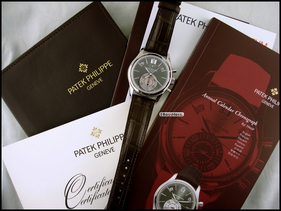 Model Ref Number: 5960P-001 A Patek Philippe chronograph: the long-awaited first-ever Patek Philippe self-winding Annual Calendar Chronograph introduced only in platinum. A very complex and ingenious movement comprising 456 parts to offer a reliable and easy to use chronograph. The design style of the new Patek Philippe chronograph is in the continuity of Patek Philippe's signature style. The innovative mono-counter dial has been designed to offer very good readability and a technical touch to the style. Chronograph with 60-minute and 12-hour monocounter at 6 o'clock Day, date, and month in apertures Power reserve and day/night display Anthracite dial, gold applied hour markers Strap: alligator with large rectangular scales, hand-stitched, matt dark brown Fold-over clasp Sapphire crystal case back Water resistant to 30 m