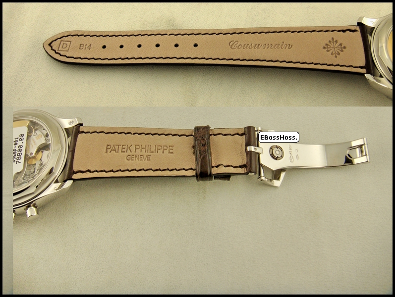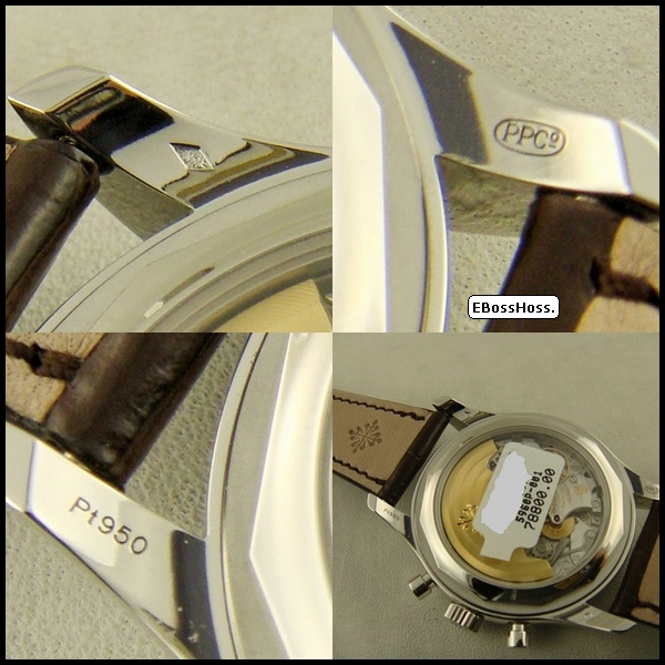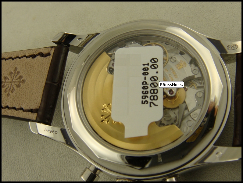 • Condition: As-BNIB--As-new exactly as received from Patek AD Model Ref Number: 5960P-001 A totally new Patek Philippe chronograph: the long awaited first ever Patek Philippe self winding Annual Calendar Chronograph introduced only in platinum. A very complex and ingenious movement comprising 456 parts to offer a reliable and easy to use chronograph. The design style of the new Patek Philippe chronograph is in the continuity of Patek Philippe's signature style. The innovative mono-counter dial has been designed to offer very good readability and a technical touch to the style. Chronograph with 60-minute and 12-hour monocounter at 6 o'clock Day, date, and month in apertures Power reserve and day/night display Anthracite dial, gold applied hour markers Strap: alligator with large rectangular scales, hand-stitched, matt dark brown Fold-over clasp Sapphire crystal case back Water resistant to 30 m